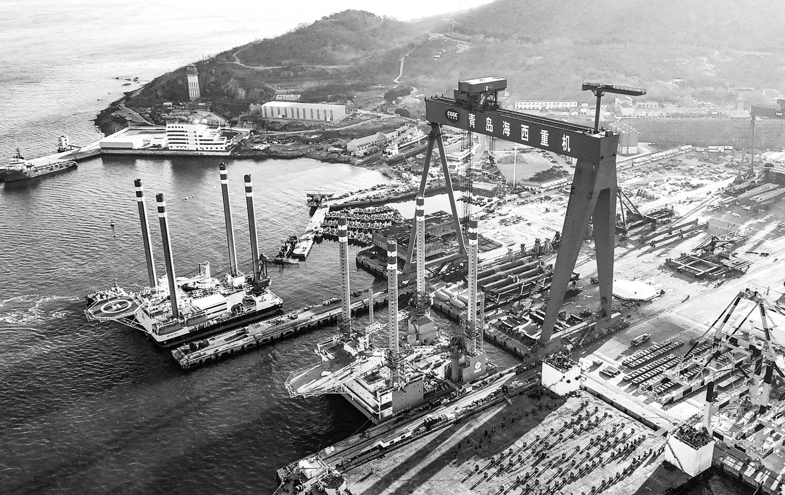 1月22日,由中船武汉船机海西重机自主设计建造的两座新一代自升式海上作业支持平台停靠岸边,准备从青岛西海岸新区发往中东(无人机照片)。