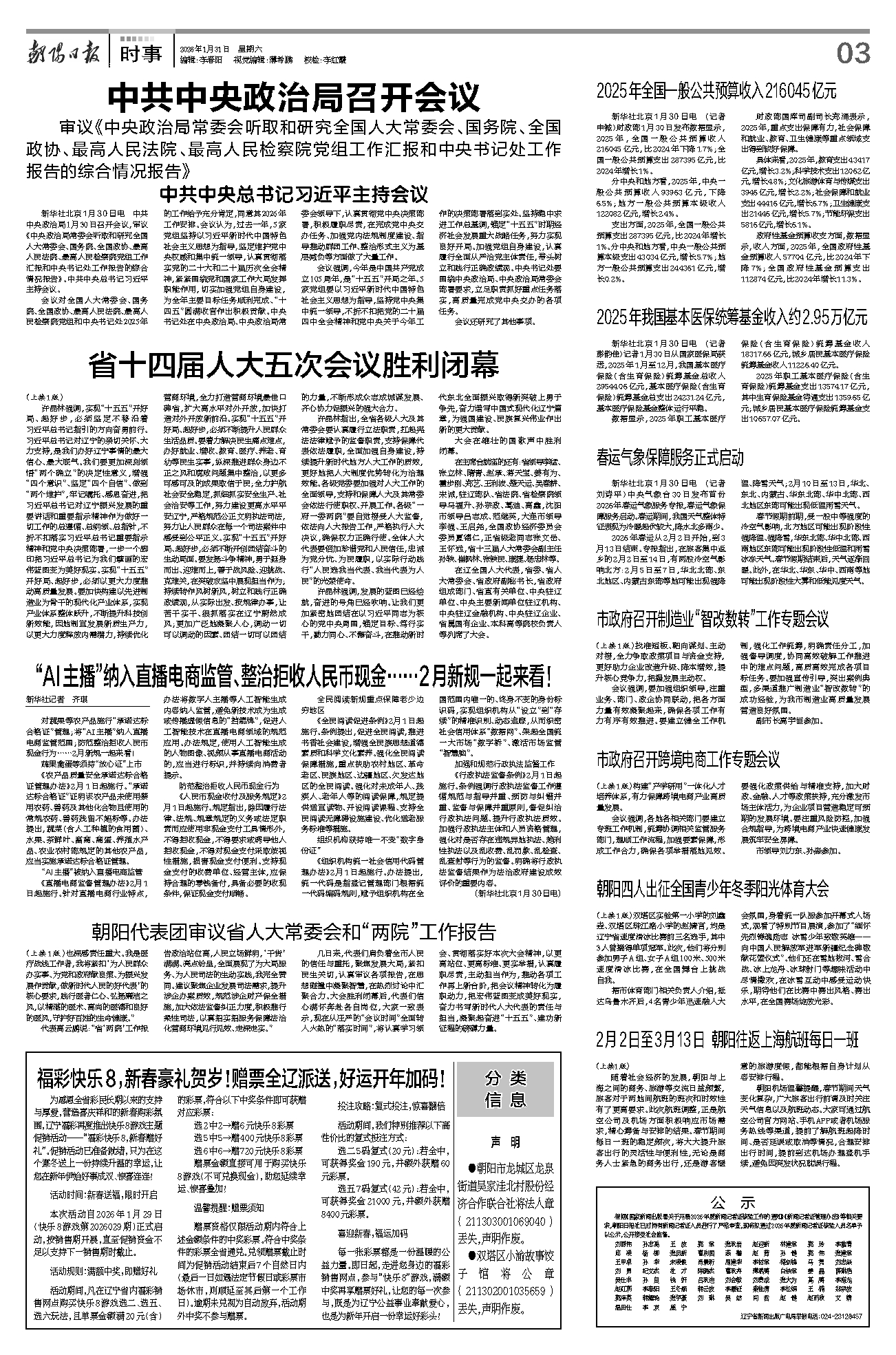 新华社北京1月30日电 (记者 申铖)财政部1月30日发布数据显示,2025年,全国一般公共预算收入216045亿元,比2024年下降1.7%;全国一般公共预算支出287395亿元,比2024年增长1%。