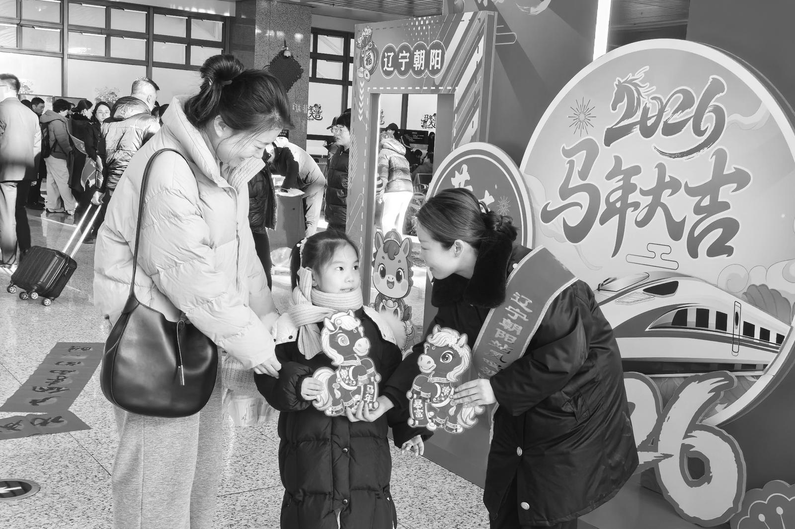 不远处,五岁的小女孩朵朵(化名)举着刚领到的生肖马挂饰蹦蹦跳跳。这是她今年收到的第一份新年礼物,稚嫩的笑声引得周围旅客纷纷驻足拍照。活动现场,工作人员还为旅客准备了“福袋”,内含春联、窗花等文创小物,吸引众人排队领取。