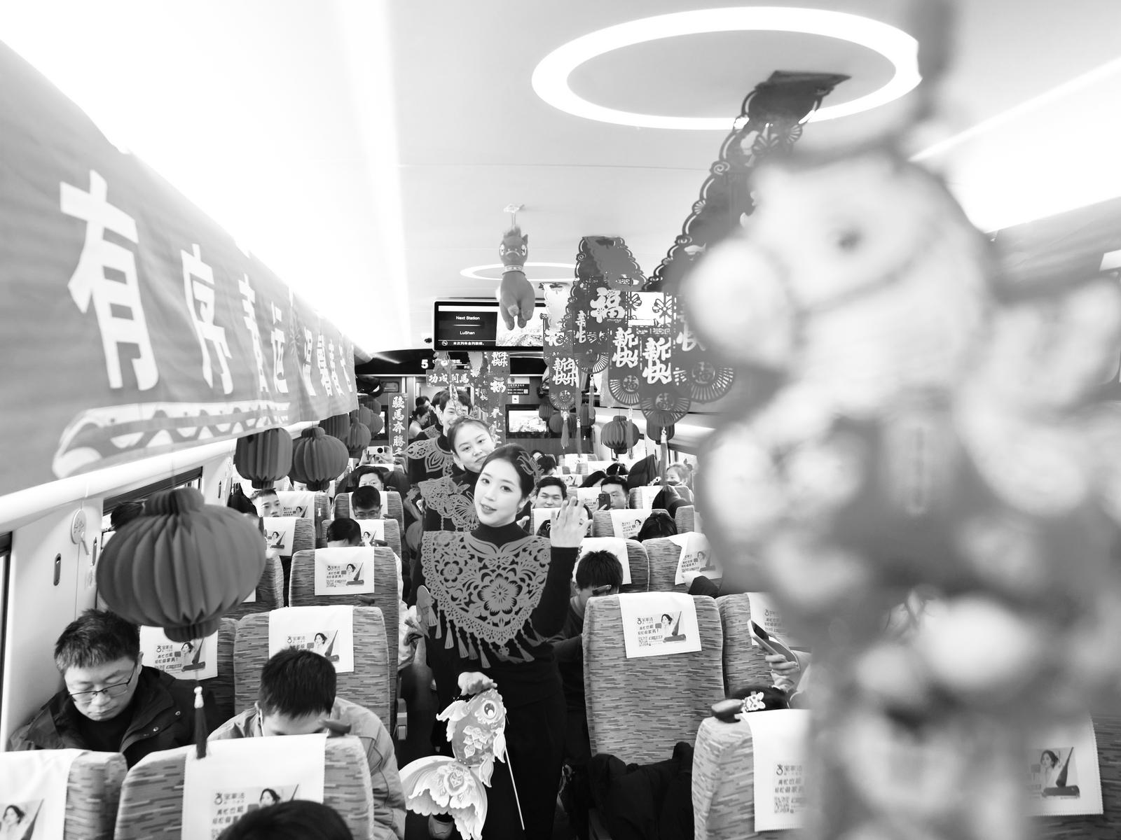 2月2日,南昌西至北京西的G336次列车上,工作人员为旅客展示舞蹈。2月2日,2026年春运启动,到3月13日结束。 新华社发 (杨铭鸣摄)