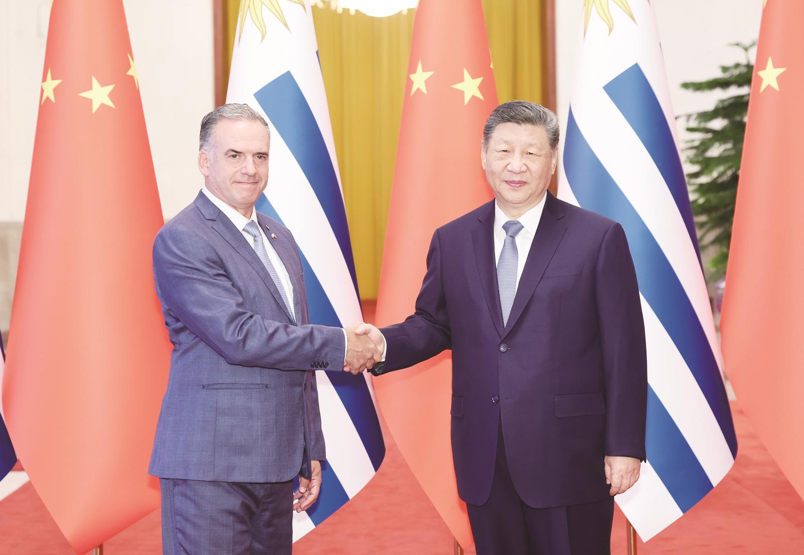 习近平强调,中乌两国要继续坚定支持彼此核心利益和重大关切,密切各层级、全方位友好交往,加强治国理政经验交流,不断深化战略互信。中共二十届四中全会通过“十五五”规划建议,为未来5年中国经济社会发展擘画蓝图,也为包括乌拉圭在内的各国提供更多机遇。双方要加强发展战略对接,深化经贸、金融、农牧业、基础设施建设、信息通信等合作,挖掘绿色发展、(下转3版)