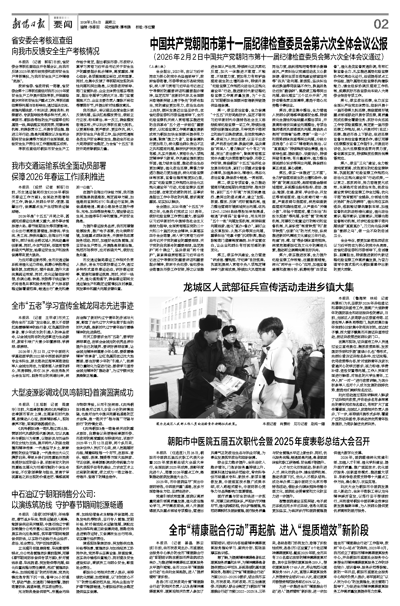 全会指出,2025年,在以习近平同志为核心的党中央坚强领导下,按照省委部署,市委带领全市各级党组织,深入学习贯彻习近平总书记在辽宁考察时的重要讲话和重要指示精神,坚定扛牢“在新时代东北全面振兴取得新突破上勇于争先”的使命担当,党的建设更加有力,政治生态向上向好,振兴发展迈出坚实步伐。在省纪委监委和市委坚强领导下,全市纪检监察机关深入贯彻落实推进党的自我革命“五个进一步到位”重要要求,以纪检监察工作高质量发展新成效为朝阳加快全面振兴提供有力保障。聚焦“国之大者”,监督保障执行更加有力;深化整治群众身边不正之风和腐败问题,解民忧护民利更加有感;扎实开展深入贯彻中央八项规定精神学习教育,作风建设堤坝更加牢固;强力惩贪治腐,推动政治生态更加清朗;强化政治巡察,震慑力穿透力推动力更加强劲;深化纪检监察体制改革,监督治理效能更加凸显;抓实“纪检监察工作规范化法治化正规化建设年”行动,纪检监察队伍更加过硬。在肯定成绩的同时,实事求是指出工作中存在的问题,要求高度重视、切实加以解决。