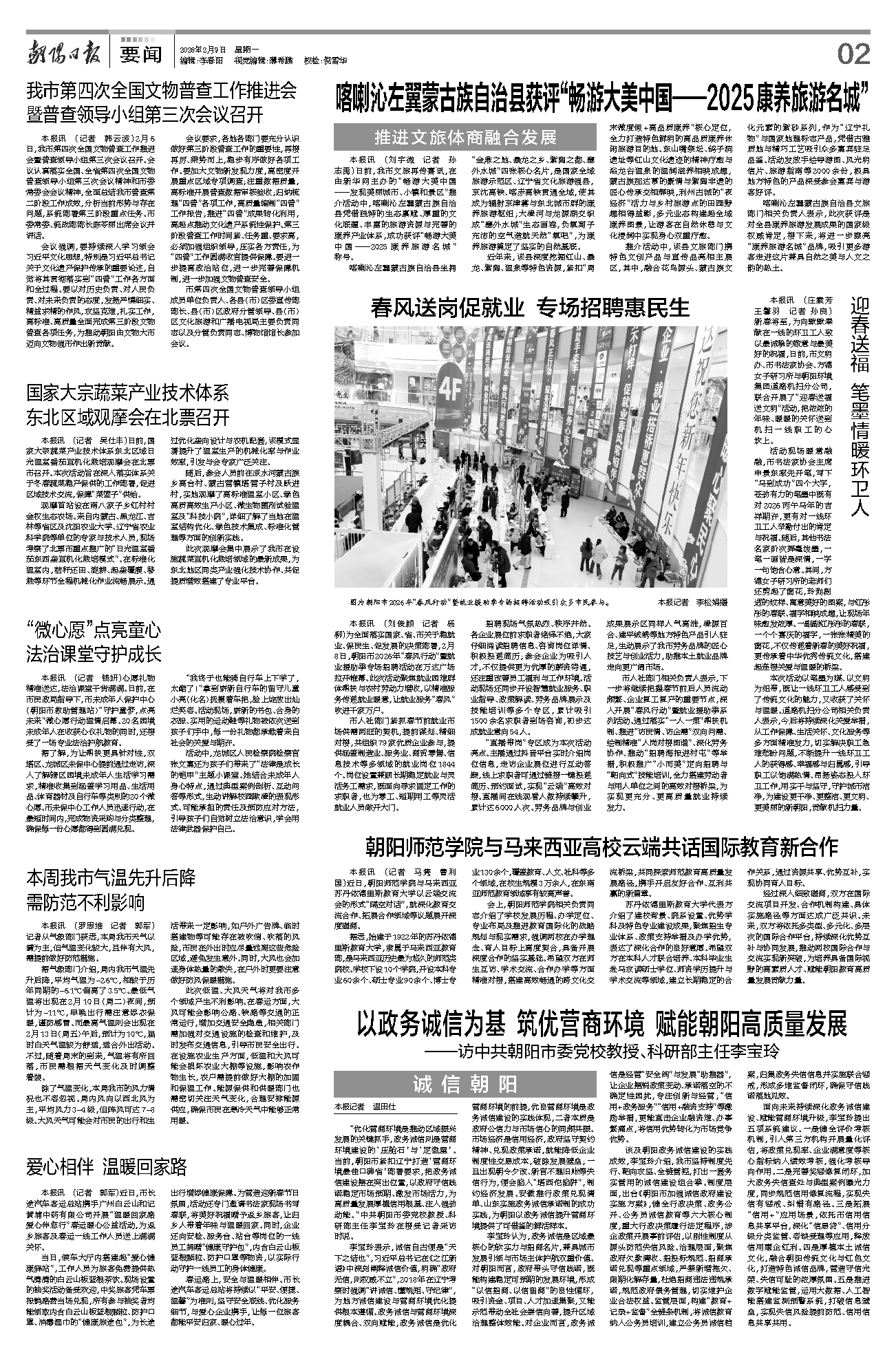 本报讯 (刘俊颖 记者 杨柳)为全面落实国家、省、市关于稳就业、保民生、促发展的决策部署,2月8日,朝阳市2026年“春风行动”暨就业援助季专场招聘活动在万达广场拉开帷幕。此次活动聚焦就业困难群体帮扶与农村劳动力增收,以精准服务传递就业暖意,让就业服务“春风”吹进千家万户。