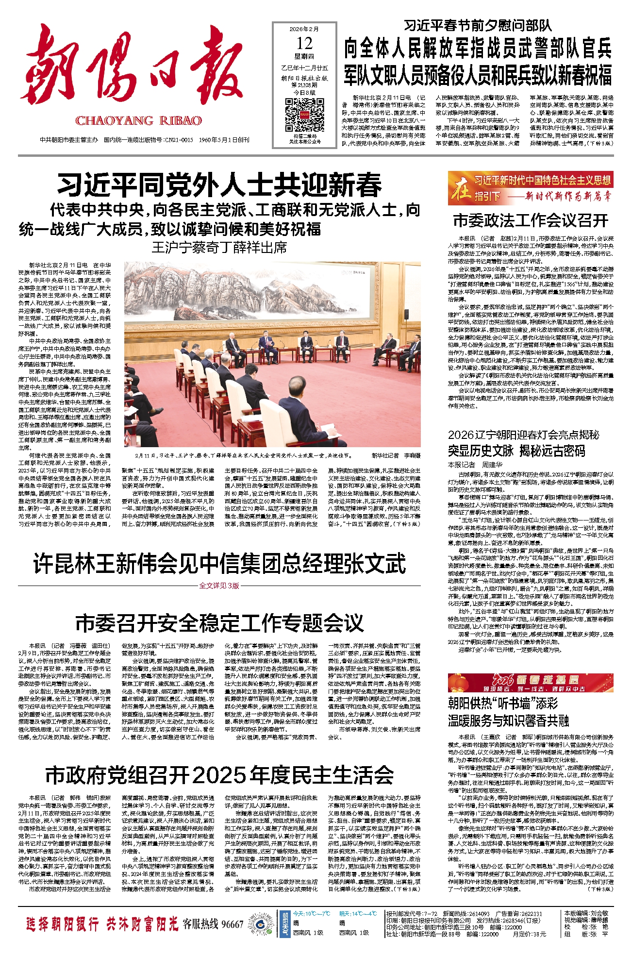 会议强调,要坚决维护政治安全,提高政治警觉,全面消除风险隐患,确保绝对安全。要毫不放松抓好安全生产工作,聚焦工矿商贸、建筑施工、道路交通、危化品、冬季取暖、烟花爆竹、城镇燃气等重点领域,紧盯园区景区、大型商超、农村市集等人员密集场所,深入开展隐患排查整治,坚决遏制各类事故发生。要打好森林草原防灭火主动仗,加大常态化巡护巡查力度,切实做到守住山、看住人、管住火。要全面推进信访工作法治化,着力在“事要解决”上下功夫,及时解决群众合理诉求。要强化社会治安防控,加强矛盾纠纷排查化解,提高见警率、管事率,依法严厉打击各类违法犯罪,不断提升人民群众满意度和安全感。要巩固壮大主流舆论影响力,持续为朝阳高质量发展树立良好预期、凝聚强大共识。要统筹做好春节期间有关工作,加强困难群众关爱帮扶,保障农民工工资按时足额发放,进一步做好物资保供、冬季供暖、帮扶慰问等工作,确保全市群众度过平安祥和欢乐的新春佳节。