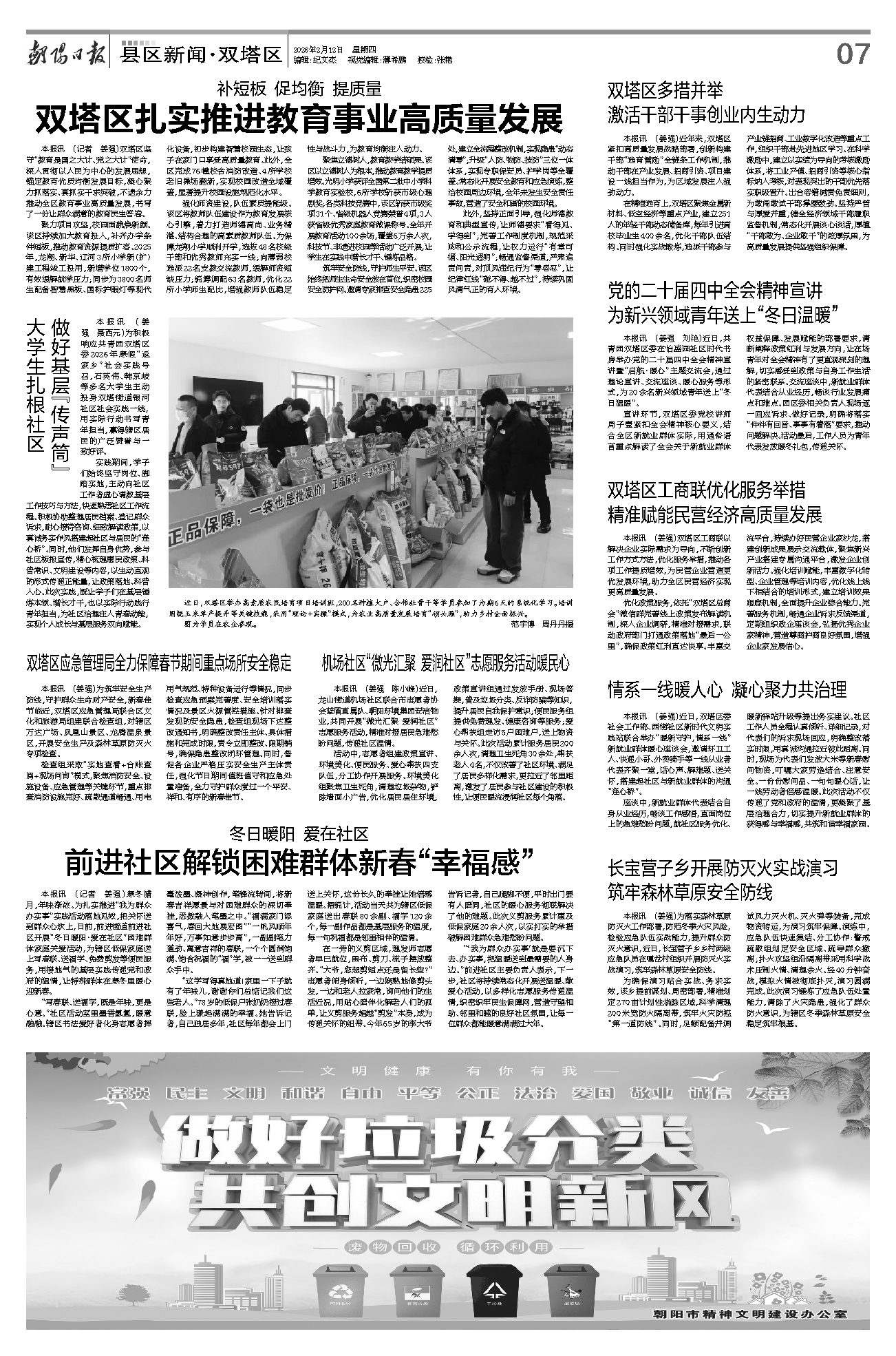 本报讯 (记者 姜强)双塔区坚守“教育是国之大计、党之大计”使命,深入贯彻以人民为中心的发展思想,锚定教育优质均衡发展目标,凝心聚力抓落实、真抓实干求突破,不遗余力推动全区教育事业高质量发展,书写了一份让群众满意的教育民生答卷。