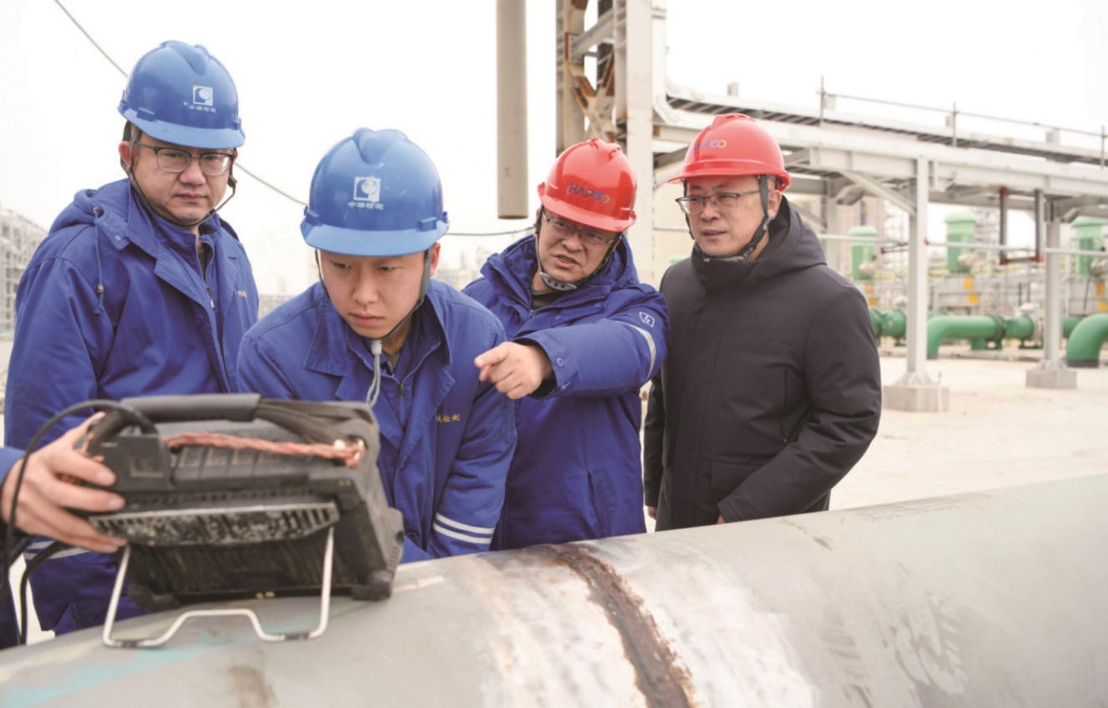 当记者到达公用管廊化工区时,质量管理部高级主管田金龙正在监督检查图幅一工艺管线相控阵超声波检测工作。王国浩、伞建宇等检测员在一条焊缝上涂抹耦合剂后,将一台笔记本电脑大小的相控阵仪器放置好,精准控制探头走向与耦合状态。他们紧盯仪器显示屏,认真捕捉每一组波形数据、每一处细微信号变化,不放过任何潜在缺陷……